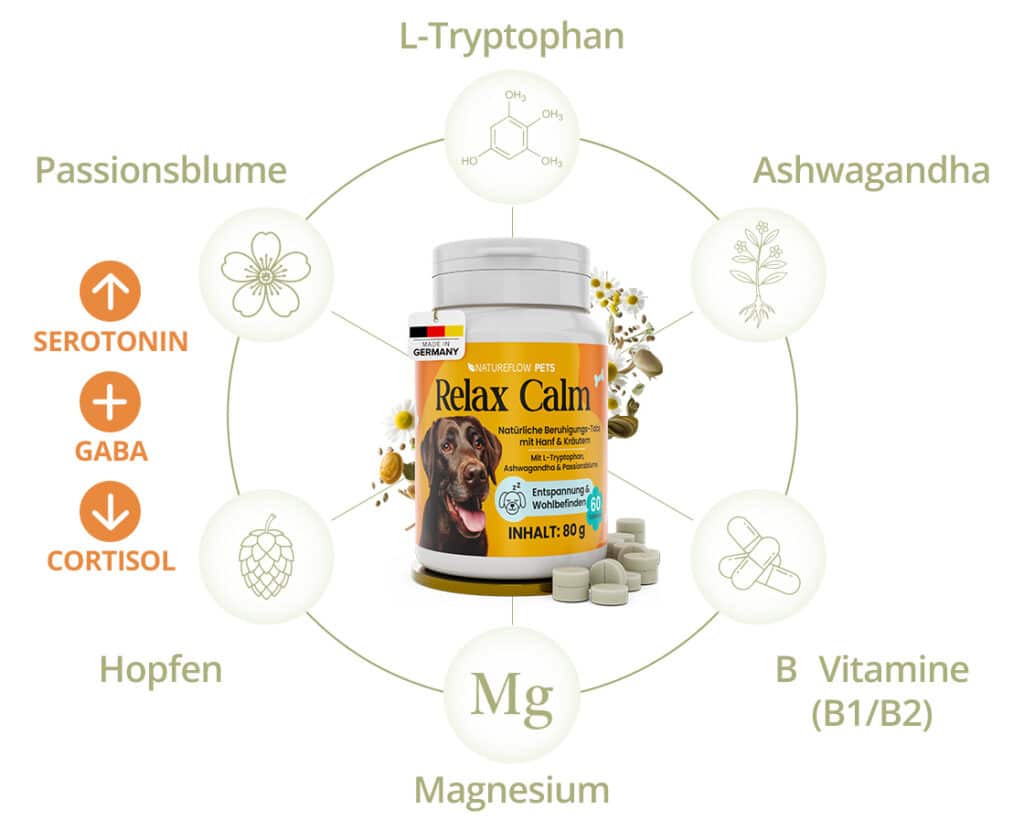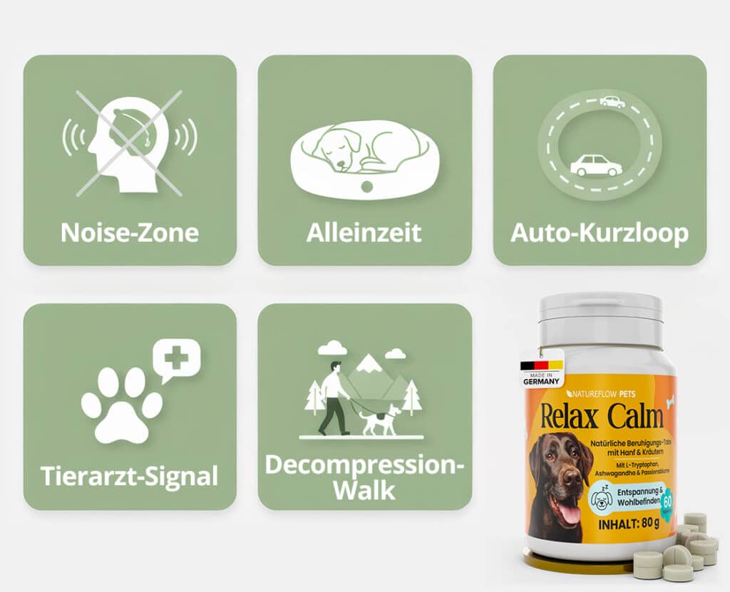 Relax‑Calm ist eine natürliche Basismodulation und ersetzt keine individuelle Diagnostik. Bei bestehenden Erkrankungen, Trächtigkeit/Laktation oder paralleler Medikation Rücksprache mit Ihrer Tierärztin/Ihrem Tierarzt halten.